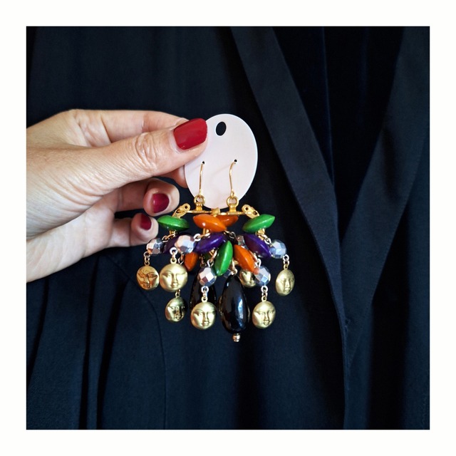 バラエティーシリーズ 扇をモチーフにしたちょっと聖なる耳飾り 私の大好きな素材をたっぷり纏った作品です。 キーリングに通したウッドビーズ間に アクリルビーズ/顔、 そして中央にドロップビーズを飾りました。 重厚感はあるけれど全然重くない! 質感の違う異素材が不思議と融合する 魅惑のデザインをどうぞ~ 注) ウッドビーズ&真鍮素材は傷、剥げがあります。 実際の色味と異なる場合があります。 ◆素材 ・ウッドビーズ (グリーン/ダークパープル/オレンジ) ・アクリルビーズ(メタリックシルバー) ・顔(真鍮) ・ドロップビーズ(アクリル) ・キーリング(真鍮) ・ピアス/イヤリング 「ご購入前に・・・」をご確認下さい。 宜しくお願い致します。